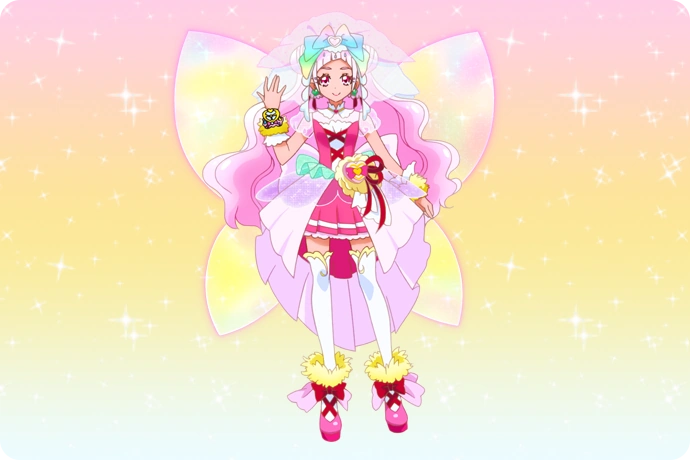 Der Kristall der Zukunft Mother Heart verleiht den Cures, zusätzlich zum Cheerful Style ein Paar Regenbogen-Flügel.