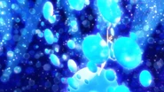 Der Herz-Kristall leuchtet blau und lässt ein Haufen Blubberblasen frei. Die Blubberblasen öffnen Chiyus Pferdeschwanz. Chiyu steht auf einer Blase und schwingt den Healing Stick um sich herum und anschließend über sich, wobei die Blasen zu einem weißen Kittel werden. Chiyu schmeißt den Kittel über ihre Schultern und berührt ihre Füße mit ihrem Stick, wobei ihre Schuhe erscheinen. Sie bewegt ihre Hände ruckartig und ihre Handschuhe erscheinen. Anschließend wickelt sich ihr Kittel um ihren Körper, und verwandelt sich ihn ihr Outfit. Der türkise Teil des Rocks erscheint, sowie die blaue Schleife auf ihrem Rücken und der dunkelblaue Tropfen, an dem ein weißes Tuch angebracht ist. Chiyus Haare werden anschließend länger und werden hellblau. Die Haare teilen sich in zwei und werden in einen Pferdeschwanz gestylt. Als nächstes erscheinen ihre Ohrringe, ihre Herz-Tiara und Blubberblasen befestigen sich in ihren Haaren. Als letztes erscheint ein Stream aus Wasser. Sie tippt ein letztes Mal auf den Healing Stick und stellt sich zusammen mit Pegitan als Cure Fontaine vor.