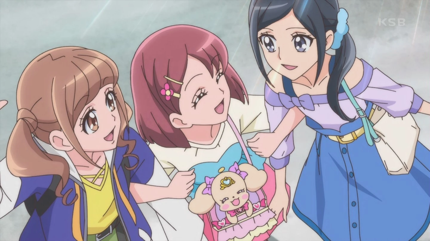 Confundido, el Megabyogen hace que Shindoine suelte a Pegitan, quien revota en la cabeza de la recién llegada Nodoka y acaba en manos de Chiyu. Las tres se transforman en Pretty Cure mientras Shindoine les dice que son unas impertinentes. Fontaine golpea los tentáculos del monstruo y le explica a Sparkle lo que significa. Grace usa su escudo para protegerse del monstruo y las tres saltan para darle una patada. Tras localizar al espíritu Fontaine lanza la "Corriente Sanadora Pretty Cure" con el que lo cura. Ellas comprueban que el espíritu se encuentra bien mientras Pegitan se disculpa. Chiyu regaña a Hinata por ponerse en peligro mientras Nodoka interviene diciendo que desde ahora las tres se esforzarán al máximo.