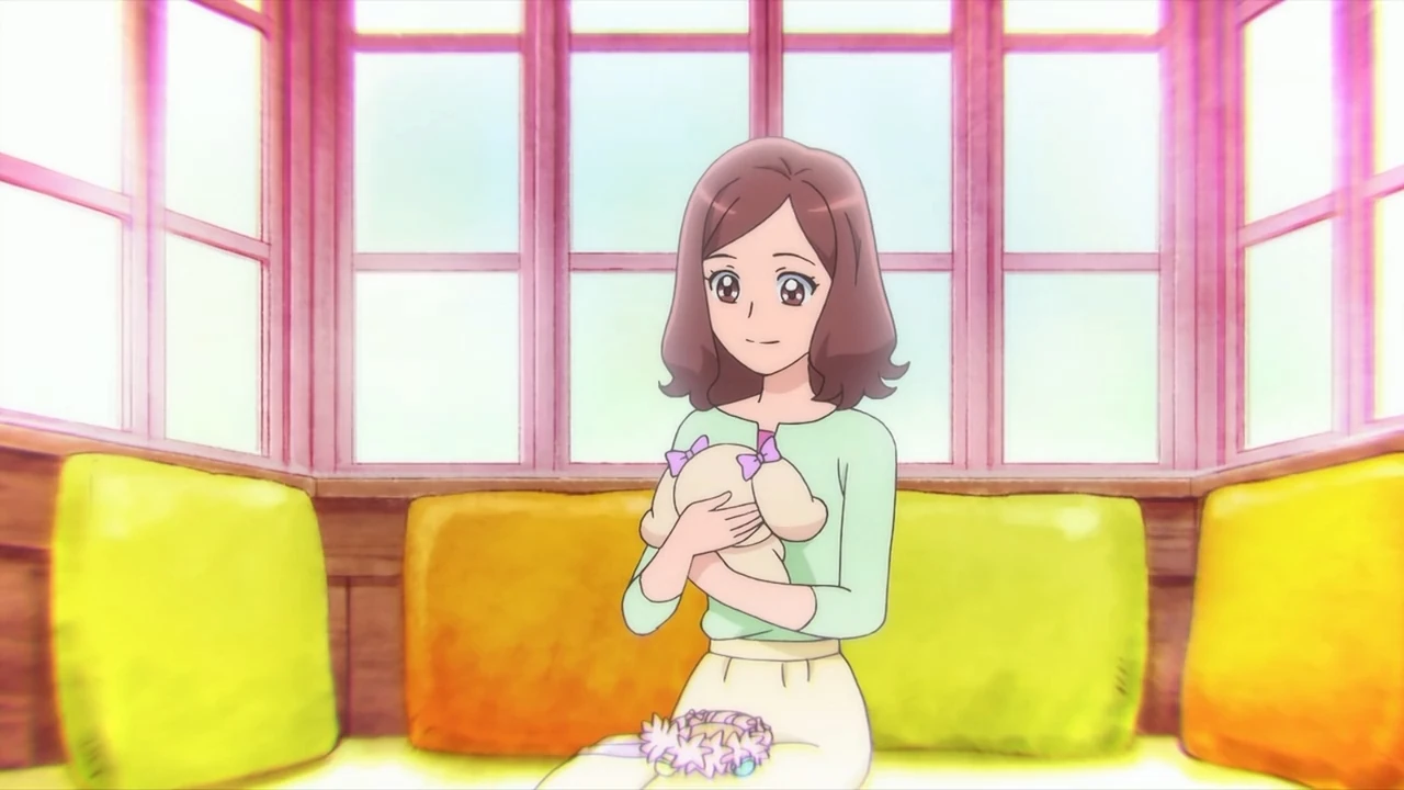 Hinata está visitando la casa de Nodoka y descubre que su padre, Takeshi, se dedica a diseñar interiores. La madre de Nodoka, Yasuko, recuerda que de pequeña solía ir a las aguas termales Sawaizumi así que Chiyu la invita a ir otra vez mientras comenta que ahora tienen una sauna para mascotas también. En la cena, sus padres están muy contentos de que Nodoka haya hecho amigas tan buenas por lo que Yasuko anuncia que va a volver a trabajar. En su habitación, Nodoka le explica a Rabirin que su madre dejó de trabajar para cuidar de ella así que está muy contenta de que pueda volver. Al día siguiente, las chicas se alegran por la madre de Nodoka y descubren que trabaja como transportista. En casa, Latte busca a Yasuko, pero Rabirin le dice que está trabajando. Mientras tanto, Shindoine se está quejando de las Pretty Cure a la vez que Guaiwaru se burla de ella. Al día siguiente, la familia Hanadera se vuelve a marchar así que los Animales Sanadores deciden visitar a Latte para entretenerla. Como Latte no come, Nyatoran abre la ventana para que juegue en el jardín, pero entonces Latte se escapa. Mientras Nyatoran y Pegitan siguen a la princesa, Rabirin va a buscar a Nodoka para contarle la situación. Ellas finalmente la encuentran en la empresa donde trabaja Yasuko, ya que Latte la echaba de menos. Al preguntar una encargada les dice que Yasuko debe de estar en el huerto de fresas. Usando el estetoscopio, Latte les dice que Yasuko la cuidaba muy bien cuando estaban solas y le recordaba a la Reina Teatine. Nodoka la entiende ya que cuando estaba enferma siempre estaba buscando a su madre cuando no la veía. Mientras tanto, Daurizen aparece en el huerto de fresas y usa al Espíritu de la Cosecha para formar un Megabyogen. Yasuko y el encargado del huerto ven al monstruo mientras Latte indica a las chicas donde encontrarlo. Al estar tan lejos, Nodoka empieza a cansarse así que Chiyu le sugiere que espere mientras ellas se encargan, pero Nodoka no está dispuesta a dejar a su madre en peligro. El encargado se preocupa por sus fresas y Daruizen se burla de él, por lo que Yasuko sale en su defensa. Daruizen la empuja justo cuando las chicas llegan y se transforman en Pretty Cure. Ellas esquivan el ataque del monstruo y Grace lanza un disparo contra este. Usando sus escudos consiguen inmovilizarlo, pero este levanta sus hojas y las tira hacia atrás. Grace se queda atascada en una parte del suelo infectada mientras Fontaine y Sparkle son atacadas por el Megabyogen. Ellas levantan sus escudos para protegerse del mazo del monstruo. Daruizen se burla de Grace por no poder ir a ayudar a sus amigas así que coge algo de corrupción y la pone sobre Rabirin. Grace le pregunta porque hacen todo eso y Daruizen le confiesa que le gustan más las cosas cuando están corruptas. Daruizen pone algo de corrupción en la mejilla de Grace diciendo que solo le importan sus sentimientos.