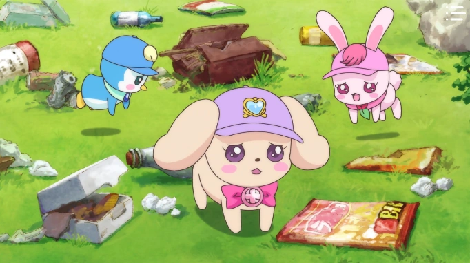 Asumi le comenta a Nodoka que va a ayudar en la tienda de bollos Sukoyaka y esta le dice que están en la temporada de ocio pues mucha gente aprovecha para hacer actividades que normalmente no tienen tiempo para hacer. A Rabirin se le ocurre hacer un tour de otoño con el resto de las hadas. Al día siguiente, Asumi está atendiendo la tienda y el dependiente le agradece su ayuda. En el Jardín Sanador, la Reina Teatine comprueba que sus súbditos se encuentran bien. Liyon y Trigon, dos de las hadas adultas, dicen que se están recuperando, pero temen que Rabirin y los demás se despisten de su misión pues son todavía novatos. En la Tierra, las hadas juegan con Latte al béisbol con una pelota de fútbol, pero una bolsa tapa la vista de Nyatoran y Latte lanza la pelota contra Pegitan, aunque Rabirin consigue salvarlo. Una lata los derriba entonces a los dos mientras Latte consigue dar una vuelta y los espíritu la animan. Se dan cuenta entonces que hay un montón de basura en el bosque donde están jugando y los espíritus les dicen que muchos turistas dejan ahí su basura cuando hacen picnics. Sin embargo, el comité de limpieza va todos lo fines de semana a limpiar la zona. Las hadas deciden ayudarlos en secretos y van devolviendo la basura a la gente que no la tira en la papelera. En la clase de arte, las chicas se están dibujando las unas a las otras mientras se preguntan como le irá a Asumi con su trabajo. Las hadas también van al campo de flores para dibujar, donde ven al comité regar las flores y los espíritus les explican que siempre cuidan mucho de ellos. En el Reino Byogen, Shindoine se queja de como el otoño estropea su maquillaje mientras Guaiwaru lee un libor. Esta se lo quita dispuesta a demostrar que puede leerlo como él, pero entonces descubre que son solo imágenes. Daruizen decide marcharse para así no tener que escucharlos discutir. Las hadas recogen castañas guiados por los espíritus de la Cosecha. Este evita que se metan en los cultivos de un agricultor para que no le causen problemas. Ellos ven a una niña pequeña y entonces Rabirin se pincha. La niña la ve y empiza a perseguirla pero el agricultor le dice que tiene que dejar a los animales salvajes tranquilos. Este deja un plato de comida para Rabirin y los demás. Ellos ven las hojas caer pensando que pronto el otoño se acabará y en como han crecido durante todo este tiempo. Pegitan se entristece pensando que quizás el año que viene no estarán allí pues ya habrán terminado su labor de curar la Tierra. Daruizen aparece entonces sugiriéndoles que entonces dejen de sanarla. Él pretende acabar con las hadas allí y les dice que no pueden hacer nada sin las chicas. Latte consigue huir y llega justo cuando las chicas están visitando a Asumi. El agricultor intenta detener a Daruizen de hacer daño a los animales, pero el villano lo transforma en un Gigabyogen. Daruizen les dice de nuevo que si quieren quedarse con las chicas solo tienen que dejar de sanar la Tierra, pero ellos le dicen que eso está mal pues tienen mucho que proteger. Las chicas llegan entonces y se transforman en Pretty Cure. Grace y Sparkle saltan para golpearle con una patada, pero rebota. Earth usa la Botella del Sonido para confundirlo y así Fontaine puede usar la de hielo para paralizarlo.