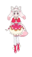 Forma Hada: Lleva un collar de color rojo intenso alrededor del cuello, que tiene una capa con volantes blancos y una joya de corazón de color rosa intenso en el medio. Cuando ella combina fuerzas y se transforma con Yui, entra en su "forma de bola de arroz". .