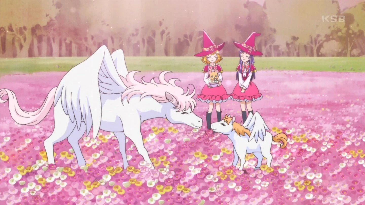 Volando por el cielo en una alfombra, Mirai se sorprende cuando el profesor Isaac dice que van a ver a los pegasos. Este explica que para la prueba de hoy tendrán que hacerse una foto con un pegaso con una pluma mágica. Emily tiene ciertas dudas pero Kay le apoya. Isaac les dice que tienen que aprovechar para mejorar su habilidad con la escoba, y para eso tienen que creer. Mirai está muy emocionada cuando Liko le dice que los pegasos no suelen salir del bosque. De repente, Mofurun se da cuenta de que están rodeados de pegasos y Mirai tratar de volar hasta ellos con su escoba, pero se cae ya que no sabe como volar todavía. En el bosque, Liko reprende a Mirai mientras Jun observa que esto debe de ser difícil para Emily ya que le tiene miedo a las alturas. Ellas se preguntan porque vieron a los pegasos fuera del bosque y Kay les cuenta una historia de miedo sobre una flor que atrae a los animales y se los come. Liko y Mirai se alejan entonces de las demás y Mirai le dice que no tiene porque tener miedo si están juntas. Liko le dice entonces que primero tiene que aprender a volar mientras Ha-chan intenta volar también. El hada es todavía muy pequeña pero lo intenta, animando a Mirai a intentarlo también. Ellas ven entonces a un pegaso y Mirai trata de volar pero su escoba sale disparada. Liko la salva de caerse y juntas tratan de engañar al pegaso para hacerse una foto. Sin embargo, la pluma se cae con Ha-chan y Mirai sale disparada para salvarla, volando muy bien. Liko la sujeta antes de que se caiga, pero ella pesa mucho y caen al fondo del bosque. Caminando por este, Liko le pregunta como pudo volar tan bien, y Mirai le contesta que solo pensaba en salvar a Ha-chan. Ellas se dan cuenta de que para volar solo necesitan creer con fuerza. Mofurun siente entonces un aroma dulce y las chicas se dan cuenta de que hay un bebé pegaso cerca. Ellas se acercan y notan que debe estar herido, mientras Mofurun se marcha. Mirai sigue entonces a Mofurun hasta un campo de flores con una flor gigante. Ella observa que hay muchos animales alrededor y recuerda la historia de Kay, pero Mofurun le asegura de que no es nada malo. Las heridas de Mirai se curan entonces y la chica recoge una flores para curar al bebé pegaso. Una vez recuperado, su madre aparece reuniéndose con su hijo. Cuando una lágrima suya cae, la flor grande se ilumina, apareciendo la Piedra Linkle Turmalina Rosa. Desde la lejanía, Sparda las observa sonriendo. El pegaso madre les da la piedra y entonces el estómago de Ha-chan suena. Liko usa la nueva piedra para invocar tortitas para todos. Mientras comen, Mirai y Liko recuerdan su tarea y le preguntan a los pegasos si pueden hacerse una foto con ellos, a lo que acceden. Cuando van a tomar la foto, Sparda aparece destruyendo las flores y la madre pegaso se encara con ella. Sparda entones la atrapa con sus telarañas e invoca un Yokubaru con la madre pegaso y unas plantas.