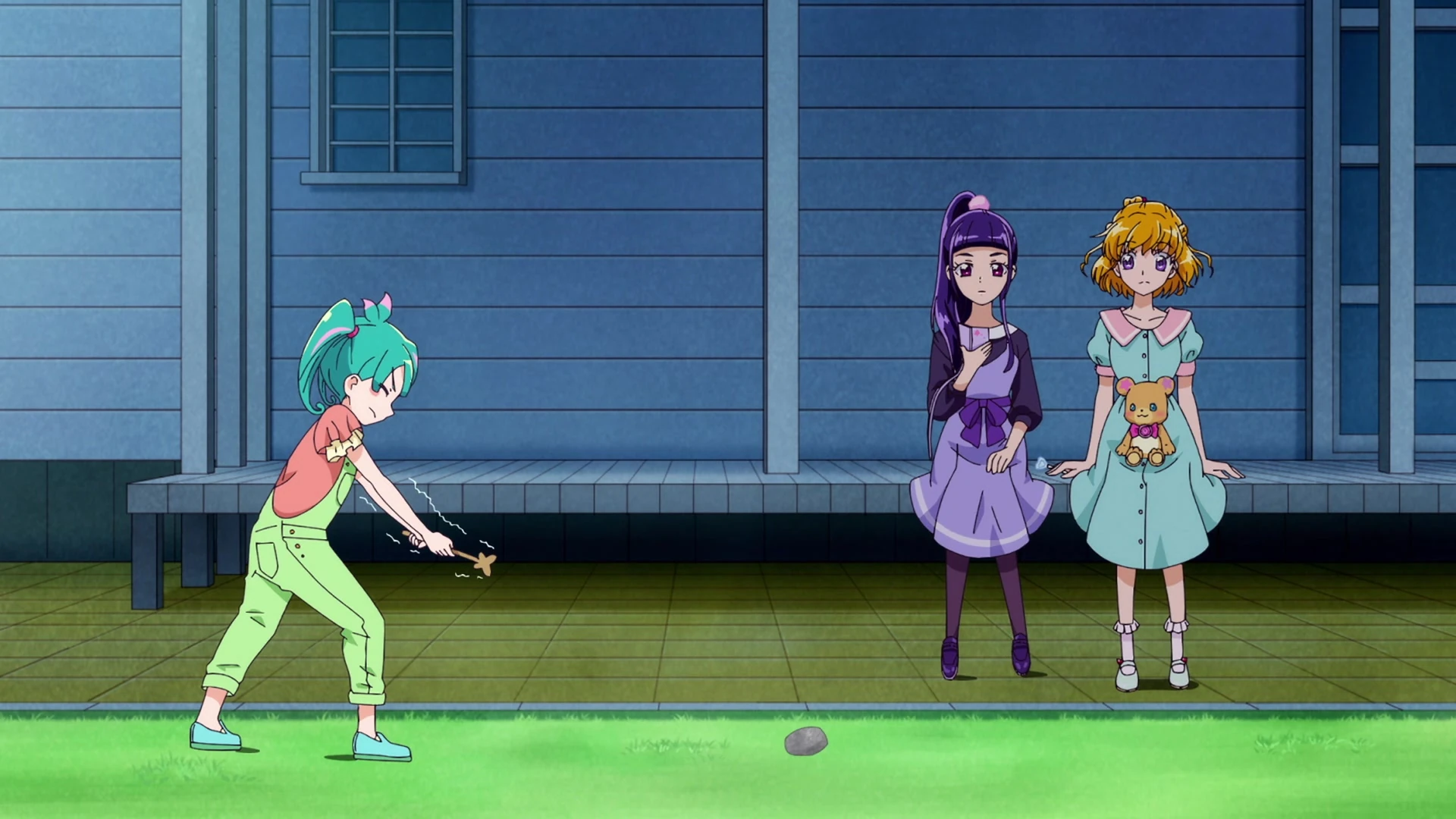 En casa de Mirai, Hisui practica con su varita de madera mientras hace que Mirai haga la magia de verdad. Liko está intentando ver la imagen de Ire con delantal que descubrió el otro día, lo que hace que Mirai recuerde su visión con los libros. Mofurun sugiere que debe de ser una librería. Hisui le pilla entonces el móvil a Liko, por lo que esta la reprende. Ella entonces ve una foto de ellas con Kotoha. Alguien pide entonces ayuda a la bruja por internet así que Mirai debe de irse, mientras Liko nota que alguien les observa. Liko y Hisui acaban acompañándola para que así termine antes y puedan buscar a Ire. La petición es buscar un gato llamado Danpa y Hisui decide encontrarlo ella para demostrar que es mejor. Ellas hacen hablar a un gato cercano que les dice unos sitios donde puede estar. Por el camino encuentran a sus antiguas amigas de la escuela, Kana y Mayumi, pero pronto se ocultan para que no las vean. Liko le echa la bronca a Mirai por usar el uniforme mágico mientras Mofurun les pide que no discutan frente a Hisui, a lo que ella protesta que ya no es una niña pequeña. Mirai tiene entonces un plan para atrapar al gato y le pide a Liko que compre comida para gatos (y aperitivos para Hisui). Su plan era dejar comida para gatos en el parque para ver si encontraban al gato, pero resulta que está prohibido. Mientras Mirai va persiguiendo a los gatos, Hisui le pregunta a Liko porque ella no puede hacer magia cuando Kotoha sí podía. Ella está disgustada porque Kotoha no aparece y les explica qué está pasando. Liko entonces ve una persona con la capa de invisibilidad y la sigue dejando a Hisui sola con Mofurun. Este resulta ser el padre de Liko, Lian, quien ha venido a proteger a Hisui por petición del Director. Él también estaba preocupado por Liko, aunque esta le dice que no necesita protección. Hisui los pilla y le dice que ella también odia que la traten como una niña y le dice a Liko que la odia mientras se va a buscar el gato. Hisui entonces se choca con Ire, pero Mirai llega antes de que pueda hacerle nada. Mofurun le da una capa de invisibilidad a Hisui para que pueda marcharse mientras Liko llega. Ire las transporta a su espacio mientras Mayumi y Kana vuelven a pasar por ahí. Las chicas se transforman en Pretty Cure mientras Ire invoca un monstruo toalla. Magical usa la Piedra Lunar para invocar un escudo y Miracle la Aguamarina para lanzar una marea. El monstruo atrapa a Miracle que se libra usando la Amatista a lo que Magical usa el Granate para invocar un terremoto.