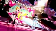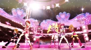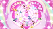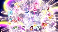 Las Pretty Cure comienzan a elevarse entonces en unos corazones planos mientras bailan. La canción termina mientras las Pretty Cure han formado un círculo en el aire. Los corazones desaparecen y las chicas empiezan a salir por grupos desde las salidas y comienzan a reunirse muy animadas en el escenario central. Cada una baila la pequeña intro de su serie donde dice el nombre de la temporada. De repente comienza a sonar Kirakira Kawaii! Pretty Cure Daishūgō ~Inochi no Hana~ haciendo que todas la bailen en el escenario central. Ellas comiezan a posar en pequeños grupos (sin ninguna relación en ellos) mientras se ven fuegos artificiales. Las Pretty Cure siguen bailando hasta que la canción terminan y posan todas juntas. Otra canción, Come on! Pretty Cure All Stars suena y las chicas bailan todas juntas mientras todo el escenario se ilumina. Bailando, forman un círculo y despues cinco pequeños círculos hasta que todas vuelven a juntarse. Una gran luz dorada sale del escenario convirtiendose en una rosa arcoiris y las chicas forman una especie de flor. Todas ellas saltan rodeadas de luz y posan en el aire. Se oyen aplausos y gritos mientras estallan fuegos artificiales. En el centro comercial, las muñecas de Melody, Rhythm y Beat despiden a las verdaderas que están en la pantalla.