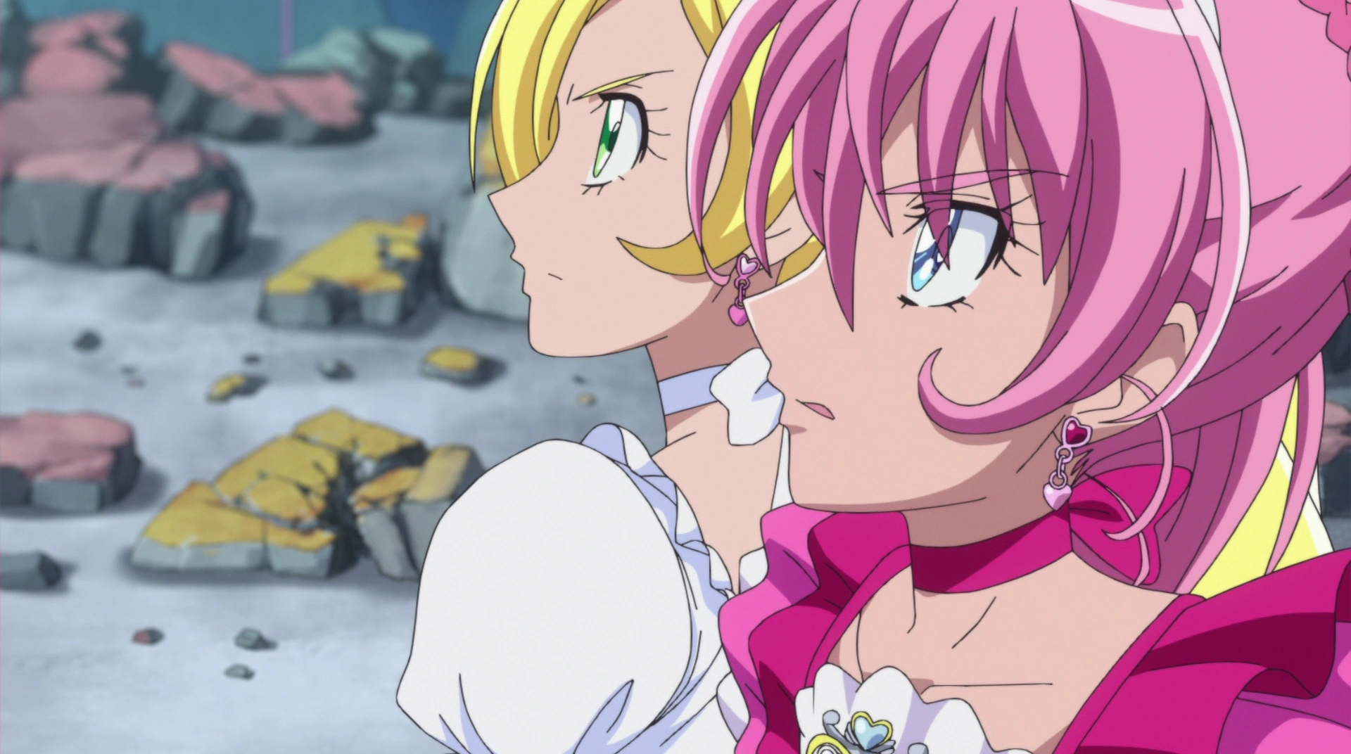 Noise les dice que es inutil pero las chicas no se rinden y lanzan los dos "Rondó Musical Pretty Cure", el "Bloqueo de Ritmo Sincero Pretty Cure" y la "Ducha Chispeante Pretty Cure". Los ataques explotan, pensando que han ganado, pero Noise resiste los ataques y lanza una esfera roja que derrumba la sala de conciertos. Las Pretty Cure salen disparadas por los aires aterrizando en una llanura junto al castillo. Noise grita que ha derrotado a las Pretty Cure. Hummy encuentra a las chicas en el suelo transformadas y heridas, mientras Noise se acerca a la torre del castillo y ve cómo todos están tocando un concierto dirigido por Aphrodite. Noise entra intentando asustar a la gente pero Aphrodite dice que es muy feliz cuando toca un concierto. Noise convierte en piedra a una parte de la banda pero ellos siguen tocando y Aphrodite le dice que nunca podrá quitarles su amor por la música. Noise les dice que se cae convirtiendo toda la Tierra Mayor en piedra. Las chicas se desaniman al ver que la música ha desaparecido pero entonces la Hadas Tono tocan una melodía. Ellas le dicen a las chicas que con ellas podrán tocar un sonido mejor y Hummy les dice que la Partitura Legendaria está en blanco por lo que pueden crear la música que quieran. Las chicas se levantan dispuestas a luchar de nuevo y no perder la esperanza.