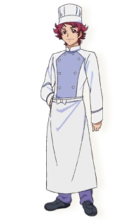 He has pink hair which is sometimes worn underneath a chef's hat, and has pink eyes. He usually wears a chef's outfit consisting of a white and purple top, a apron, purple pants, and black shoes.