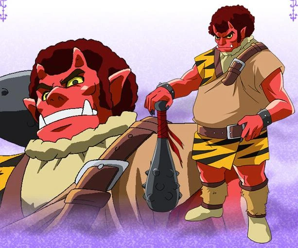 Akaoni is a red ogre from Japanese folktales. He has red skin, horns, fangs, and pointed ears and is usually seen wearing coarse brown cloth and tiger skin with leather belts. He is the largest of the three Bad End Kingdom commanders and towers over the Pretty Cure.