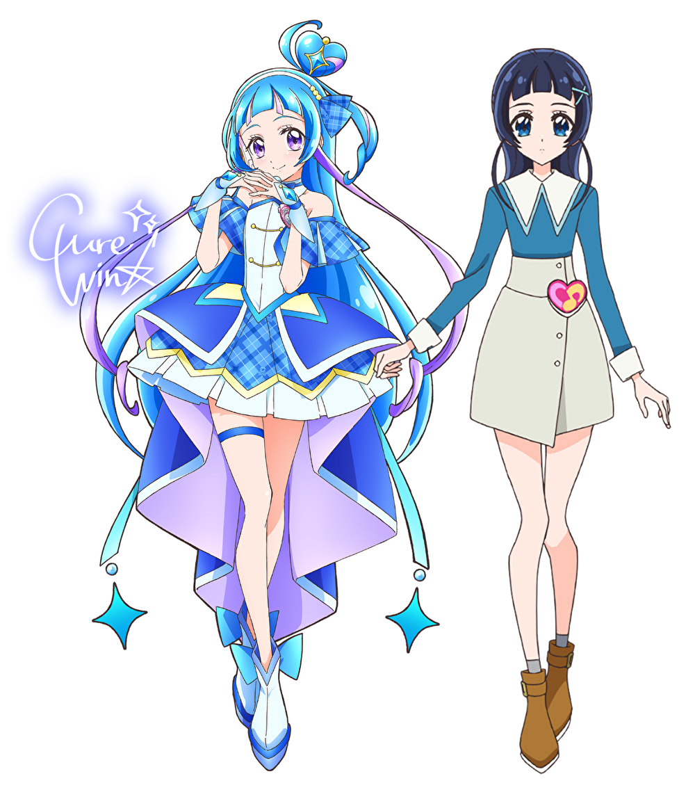 As Cure Wink, her hair grows longer to the leg, splits into two sections, and turns bright cerulean, and her eyes turn purple. Some of her hair is worn in a small heart-shaped bun on the left with a lavender streak at that same side decorated with a large four-point blue star that has a gold border and bead on top. Two tiny strands in-between her bangs are lavender as well. Her forelocks turn lavender, thicker, and grow very long to the hip in twisted ends. Her hairpiece is a small blue plaid ribbon accented with three gold pearls at the right on her white headband. The pearls accent the two ones beside her earrings and the one above the hand gem, both of which are blue and four-point star-shaped. She wears a deep blue choker that ties in the front with white fabric at the top and splits at the bottom. Her dress is sleeveless with ruffled blue plaid armbands on top, deep blue bands, and pale blue pleated inserts. The front part of the top is white with two pairs of gold buttons each connected by a thin cord. The sides of the top are light blue and cerulean diamond-shaped stripes line the top and bottom. Her Idol Heart Brooch lies on the left side of her chest with a blue diamond-shaped tie in the back of it accented by a darker one beneath. The top layer of the skirt is a navy angular cape that opens in the front with white lining at the end and pale yellow triangular panels lined with cerulean on the top. It also has a long train with a lilac insert that reaches near her feet. The middle layer of the skirt has blue plaid pleats with triangular yellow lining at the bottom while the bottom layer is pale blue and pleated. In the back are sky blue ribbon tails with blue four-pointed stars at the ends and a paler bead on top. Her wristbands are pale blue with diamond-shaped ends that flare out, deep blue cuffs, and pieces covering the back of the hand. Her boots are short and pale blue with light indigo soles, a navy angular stripe on top, and cerulean bows in the back. The tops are split with pale cerulean trim and there's a deep blue garter on her right thigh.