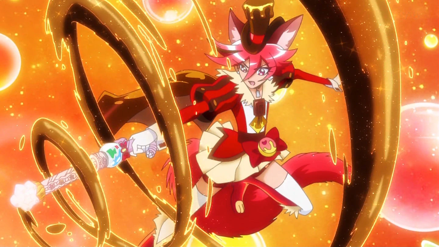 Cure Chocolat presses the red star on her Candy rod, which makes a chocolate tornado-like drill consume the target.
