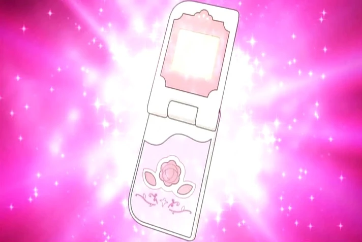 It resembles a pink pearl flip phone with light pink detailing. On top is a screen, and on the bottom is a rose button surrounded by two, smaller leaf buttons.