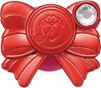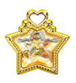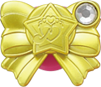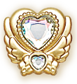 The Princess Cure Decors have a gold wing-shaped base and a gold ribbon with a heart-shaped gem in the respective Cure's color in the middle. Like the transformation decors, the Cures each have a different symbol on theirs. Happy's is a cherry blossom, Sunny's is a rose, Peace's is a group of stars, March's is a four-leaf clover, and Beauty's is a snowflake.