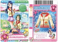 A white top lined in yellow to match the star print. A pale cream jacket lined in red and white striping is worn over it with a green J and C surrounding a mushroom. Komachi says, "Such a lovely place ♪," Karen says, "It's so peaceful!" A cute mushroom parka. It's great to wear such poppish clothes sometimes ♪ |
