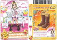 Brown boots with a red strap on the side of the foot's heel. The bottom is dark tan to match the cuff. Two red straps adorn the side of the cuff. Kanade says, "The rain's gonna stop soon ♪" The highlight's the star within the red check ♪ These all-mighty boots go with any type of clothes! |