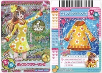 A pale yellow dress cut to reveal white material on the chest to accent the frills lining the top of the chest. A ribbon attaches from the shoulder straps to tie into a bow behind the neck. Sewn to the chest is an orange ribbon, while two stripes, one orange, one white, line the navel and hem of the skirt. A beautiful yellow halterneck dress ♪ Makes you want to wear it on a sunny day! |