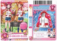 A white top with a red music note and heart motif on the lower left corner. A white jacket with a red, lilac, and hot pink cam print on the sleeves. The collar, cuff, bottom, and accent is red colored. Nozomi says, "Delicious!", Rin says, "Definitely ♪" The pink camo pattern is so~ lovely ❤ Goes perfectly with sporty wear ♪ |