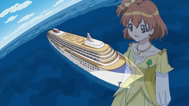 Unknown to her, Hayato is also on the ship. He changes into Westar and summons a Sorewatase using the Ship. Possessed by the evil spirit it changes direction and heads back towards the port. The girls witness this and quickly transform into Pretty Cure. Westar told them he'll stop this if they get him Infinity, but instead of listing to him, Passion hatches an idea.