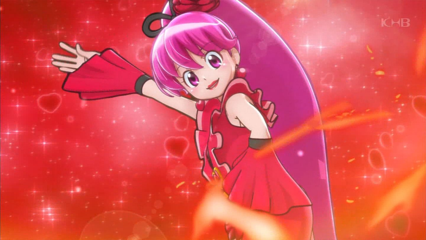 Cherry Flamenco (チェリーフラメンコ)? is Cure Lovely's first form change, and its power represents fire. In this form, Cure Lovely's hair remains the same, however with a red rose, and black ribbon are put as a decorative item. Her earrings are red heart-shaped. Her outfit is red, and its motif showing a flamenco dancer, with red roses, and also black designs, and black shoes with black ribbons. She wears also make-up. Her PreChanMirror is at the same place as Cure Lovely.