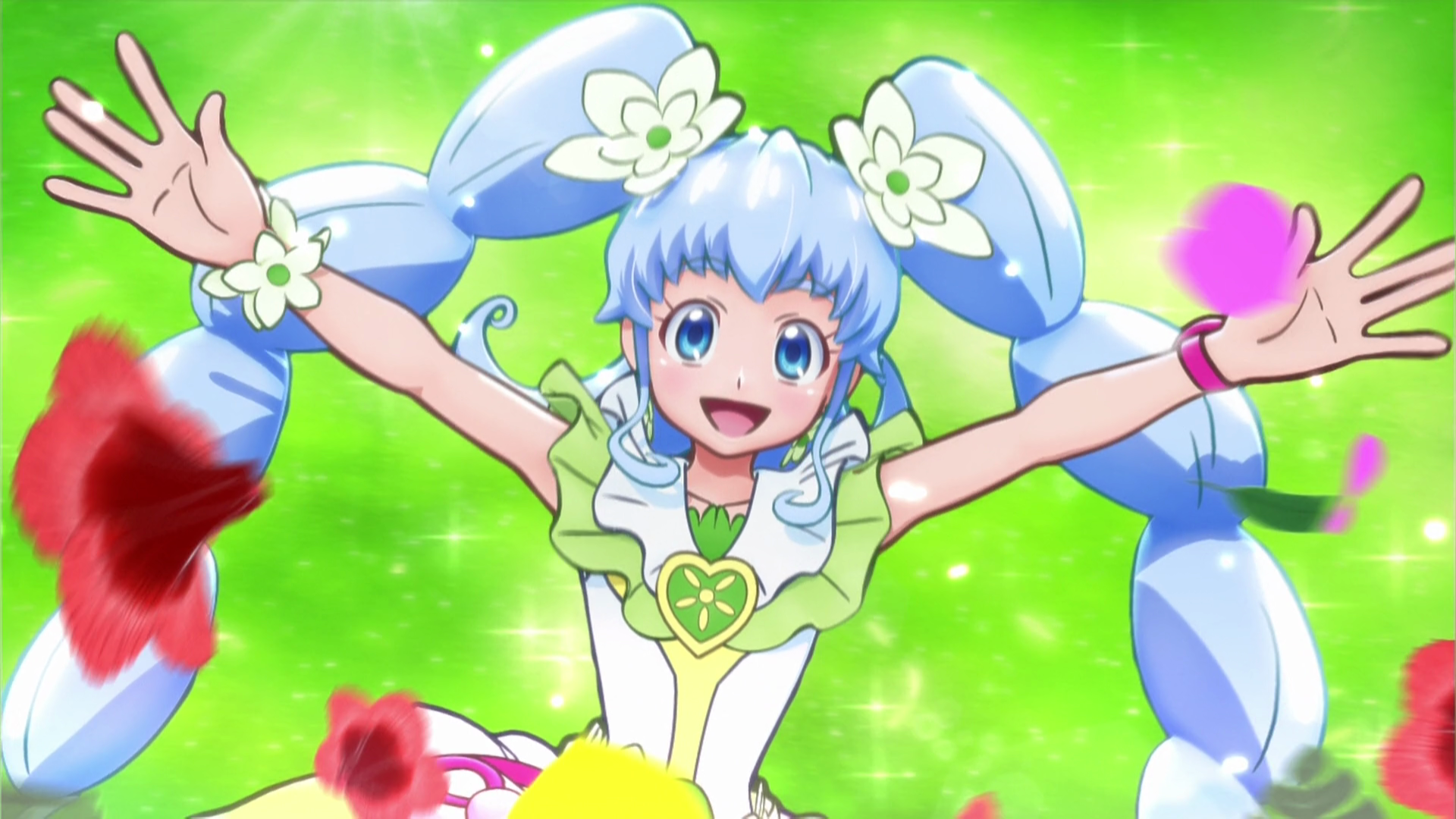 Macadamia Hula Dance (マカダミアフラダンス)? is Cure Princess' second form change. Its power represents flowers. In this form, Cure Princess' hairstyle changes into a curly and long twin tails with short strands at the back of the head, with two white flowers on the two sides. Her dress is green and white with flower decorations. Beside her PreChanMirror is a green ribbon with a white flower in the middle, and her belt is made of white flowers, too. Her dress' green layer resembles green leaves. She has green high heels with white flowers around her pastern.