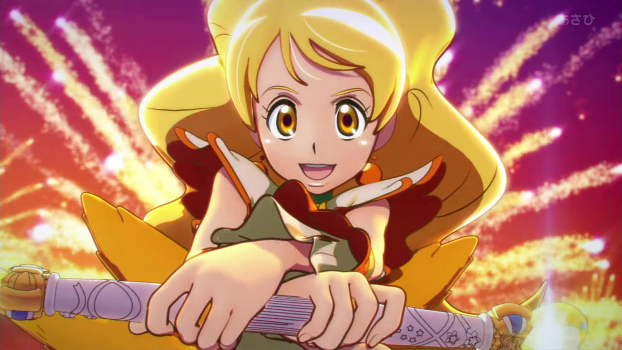 - Ribbon Heart Explosion (リボンハートエクスプロージョン)?: Her attack in her Popcorn Cheer form, performed with the Triple Dance Honey Baton in Ribbon Mode. For it, she spins the ribbon around before leaping on to the ground and forming the ribbon into a heart-shape with a pink heart forming within it. She then shouts "Victory!" With that, she does several cheerleader-like formations while the enemies do the same. She then leaps and kicks into the air and the heart explodes, sending the enemies flying.