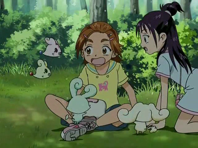 Feeling better, the girls spot a strange glowing light and Saki catches a falling object, noting that it resembles a computer when two little spirits come by to get a better look at it. They flee after the girls spot them, and hesitantly become associated with the girls, Flappy, and Choppy. Mai brings up Michiru and Kaoru to Moop and Foop and she promises they don't have any intentions to harm them when Flappy informs the group suddenly that an evil power has appeared.