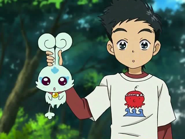 Near the Sky Tree, Saki, Mai and the others were playing hide-and-seek. They are joined by Kenta and Miyasako, who came to practice Manzai. They chat about rare animals when Kenta points out that there may be some in the bushes. He sticks his hand into it and pulls out Flappy, then drops him as he expresses surprise. Flappy, out of alarm starts to talk but tries standing still. But he is joined by the chatty Choppy, Moop, and Foop- further startling Kenta. They quickly run away as the boys freak out and take off. Saki and Mai rejoin their spirits and are informed of what occurred.