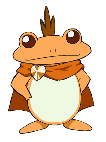 A pastel orange frog, Heart has a white tummy and big, dark auburn eyes. His tuft of hair is brown. He wears an orange cape with a heart-shaped amber gem holding it.