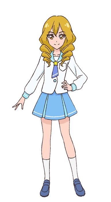 She has gold-colored hair that she wears down and curled at the ends. Her eye color is reef gold and she is typically seen wearing her school uniform.