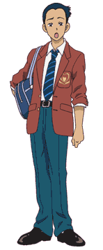 Kimata is a tall boy with light brown skin, brown eyes, and short, dark hair. He is shown in his Verone Academy male uniform, which consists of a pale maroon jacket with a navy-blue-striped necktie and a white shirt underneath. He also sports teal pants and black shoes.