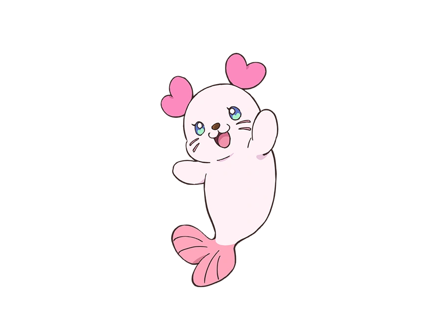 Kururun is a sea fairy that looks like a pinkish-white seal with a peach-colored tail and pink heart shaped ears. Their eyes are blue with cyan heart shaped accents.