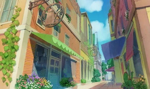 The Magic Shopping Street is lined with many shops and has stores like a clothes shop, a broom shop and a flower shop. In the center of the town, there is a flame that always burns with passion.