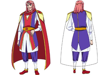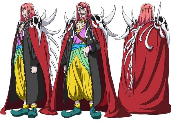 After being freed, Mephisto still has his blue eyes and light red hair. He now wears a white shirt and purple trousers, along with a light red and purple vest featuring a gold-colored belt with red jewels. He also has white socks and red shoes with gold rings around them, as well as a red cape with gold details.