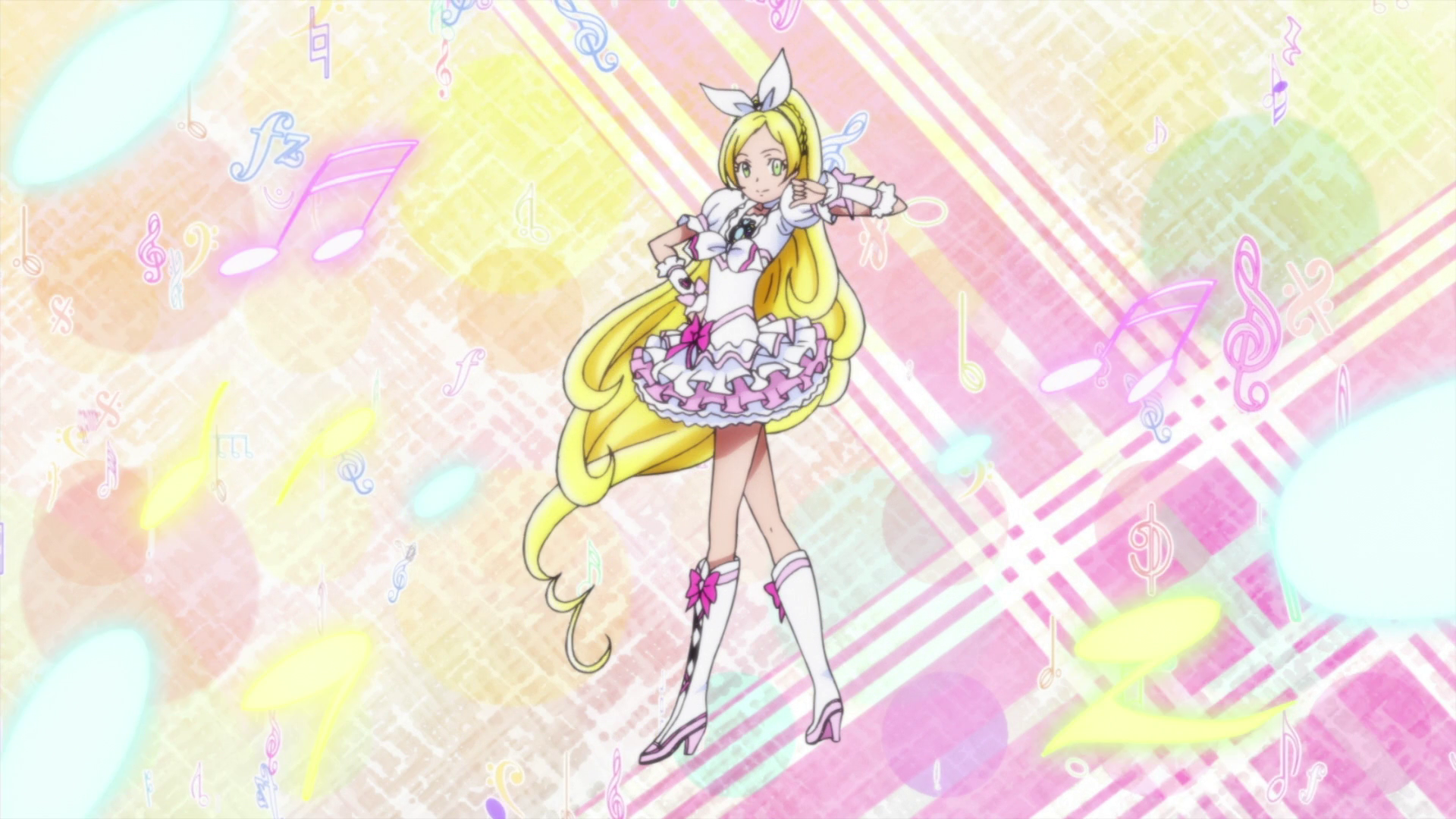 As Cure Rhythm, her eyes brighten while her hair grows longer and turns light blonde, as her now curly knee-length ponytail with a swirly strand below is held by small braids at the base of the head. Her bangs neaten a little more. She wears a white headband with a matching rabbit-ear bow and a tiny pale pink heart in the middle trimmed with pink, a white choker with a ribbon at the back, and pale pink heart-shaped earrings with a light pink heart hanging from the bottom with a chain linking them together. Her frilly white mini-dress consists of pale pink V-shaped lining around the torso and waist, with puffed sleeves that have pale pink cuffs and ruffled trimming to accentuate the neckline, the Cure Module positioned above a white knotted bow with fuchsia V-shaped stripes and a white ruffle jutting on top. Her frilly tutu consists of a two-layered white petticoat, with three more ruffly layers on top; a pale pink one on the bottom, a white one in the middle, and a matching one on top with pale pink trimming, a fuchsia ribbon on the right corner. She also gains white knee-length boots with a pale pink stripe on top, pointing tongues, fuchsia crisscrosses in the middle, pale pink toes and soles, and a pink ribbon on top with a tiny white heart lined in pale pink, and white wristbands with pale pink trimming, ruffles on the top and bottom, a pink heart with pale pink lining on top of the center, and an additional pale pink ribbon.