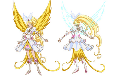 As Crescendo Cure Rhythm, her hair turns lighter and is thinner and more curled, her hair ribbon becoming white feathery wings. Her outfit pales a little, The sleeve ruffles grow as well as the wrist protector ones that lose the ribbons. Her boots lose the crisscrosses, while her top skirt layers are simplified into two white ruffly layers with a split in the middle, the top layer lined in pale pink, both of which grow out with gold feathery cape-like feathers sticking out from the front below to match the wings she obtains, which are very large with curled protrusions at the bottom with the lower wing parts. Below the skirt is a pink ruffly layer and her petticoat. She also has another waist ribbon added on the right of her hips to balance the left one out.