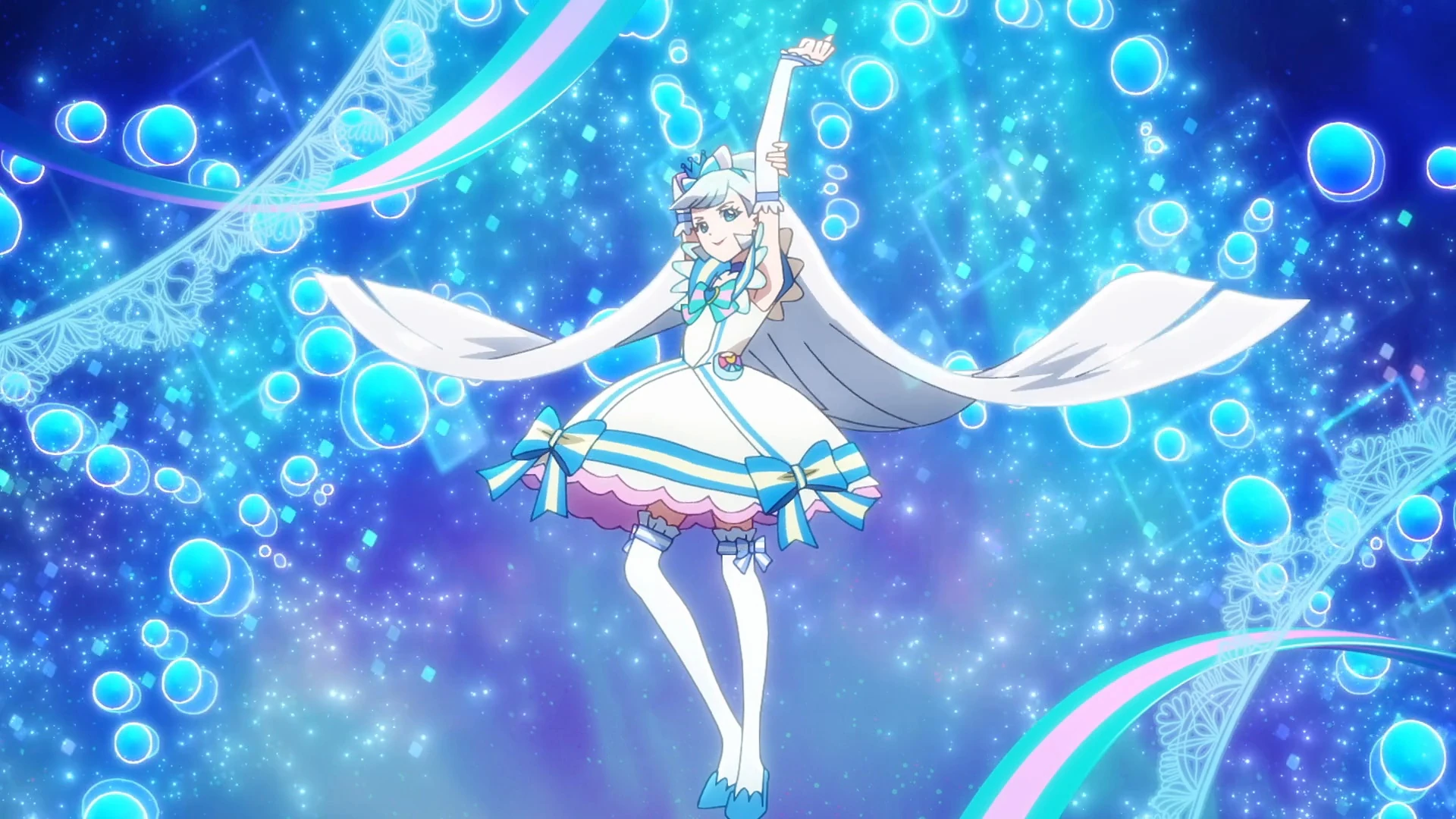 In her Diamond Ribbon Style, her hair becomes longer and has two wavy locks on each side and her crown turns into a pale pink round egg-like hat with a light purple jagged base, a blue heart with lavender trim on top, two wings with a sky blue bow on the left side, and one wing on the right. Her headband turns sky blue with a multicolored horn-like accessory on the right. Her dress turns white and slightly slimmer with a light blue bodice that closes at the neck and is held with a blue choker that has jagged white ruffles at the top and bottom. On her chest is a looped magenta, purple, blue, and teal ribbon representing her teammates' colors with a light blue diamond-shaped brooch lined in gold and a crown on top. White heart-shaped fabric covers the front part of the bodice. Her sleeves are loose and consist of blue and pale yellow-striped ribbons with white jagged ruffles on the top and bottom that go around the shoulders. Around her waist is a blue and pale yellow-striped sash with a matching bow at the back and her carry bag retained. The top layer of her skirt is white and jagged with a V-shaped bottom and blue and pale yellow-striped ribbon lining the bottom and long bows with teal hearts in the middle on each side resembling Cure Lillian's colors and accenting the foot heart, with both having one tail longer than the other. The skirt has three more scalloped layers each with a darker shade of blue. A longer opened train appears over it with three more ruffled layers of different shades of blue and a fourth layer in the back. Her wristbands are white with sky blue scalloped ends and a blue bow in the middle. Her boots are long and white with two small blue buttons behind the foot heart, blue bows in the back, and sky blue soles.