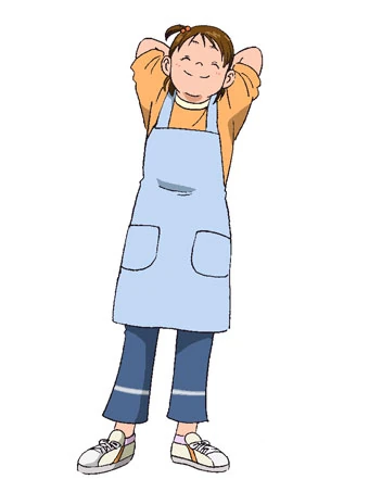 As an adult, she no longer wears her hair accessories or loose bangs. She is also shown to wear a white shirt and orange suspenders, as well as a yellow skirt, brown trousers, grey socks, and light red flats. She sometimes wears a dark blue baby carrier to carry her child.