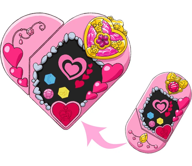 The PreHeart resembles a pink cellphone with a red and gold button on top and a black screen. The screen is bordered by different shaped and cut gems with three connected hearts on the upper right side and a red heart-shaped button on the bottom right corner. Toward the bottom part of the screen are two hexagon-shaped buttons, one blue and one yellow, and a round pink one that also resembles a gem. Whenever the Cures transform or attack, a glowing heart would appear, which can change into various colors depending on what part of the transformation they are up to. The bottom part has a golden gem with a string of pink ones lining the bottom of it. When a Mirai Crystal is inserted at the top, the bottom part is flipped to the side, making the device heart-shaped. In that form, the left side of it also has three connected hearts and a gem.