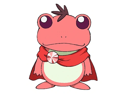 Round is a pastel red frog with white coloring on the front of his torso and big, dark purple yees. He has a small tuft of brown hair and wears a red cape held by a rounded ruby gem.