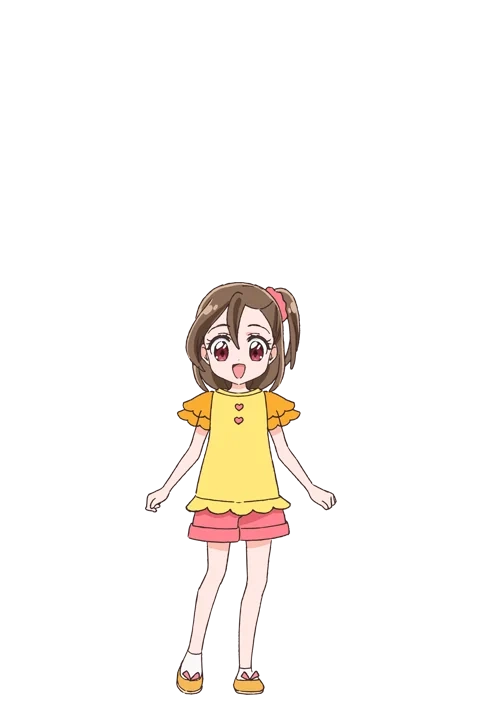Hamori has red eyes and shoulder length brown hair, with a few strands held up into a side ponytail by a light red scrunchie. She wears a yellow ruffled top that has two pink heart-shaped buttons on the front, and orange ruffled sleeves. She also wears salmon pink shorts, white ankle length socks, and orange shoes.