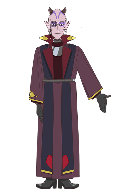 Skearhead resembles a bald middle-aged man with mauve skin. He has purple facial markings and eyeshadow, pointed ears, and black horns on top of his head. He has hazel eyes, and he sports a monocle on his right eye, as well as silver hoop earrings. Skearhead's outfit consists of a dark maroon robe with gold eye-shaped marks at the bottom of his sleeves, a red collar with yellow markings, a silver belt around his waist, and black cloth draped over both shoulders that has yellow trim and red markings at the bottom. Underneath the robe, he sports a dark red turtle neck shirt with silver trim and a silver plate on his chest and wears black gloves and boots.