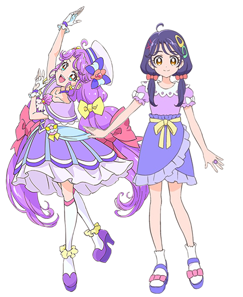 As Cure Coral, her eyes gain cyan heart-shaped flecks, and her hair turns light purple and grows long, worn like her civilian form, but held by big light yellow and pink ribbons. She also has hot pink hearts on her cheeks and a lighter one at the left. In front of the ears are curly strands and her bangs flare out. On her head is a white sailor hat tilting at the left with an indigo and light blue-striped band and bow with a pink coral-shaped shell in the middle at the same direction, followed by a big and small pink bead on top, along with a clip with yellow and pink pearls on her right, and she gains a dark purple V-shaped choker and yellow bow-shaped earrings. Her dress is light purple with a darker insert, white crisscrossed ribbons, and a low sailor collar. The collar has a white lower scalloped half and a dark purple band in the middle to accent the skirt which is wide with a short sky blue cape, pleats, and a ruffly petticoat. On top is a lilac seashell-shaped brooch and in the middle is a tiny magenta bow with a yellow pearl on top, beneath is a light pink scalloped tie. The V-shaped waistband is white. Additionally, she wears the Tropical Pact in a pale pink carry bag with a scalloped pale cyan flap, yellow bow and pastel pink star on top on her left hip, accented by a yellow ribbon. She wears light blue fingerless gloves with a heart cutout at the back and purple bands around her ruffly wrists, along with white below-knee-length socks with a pink band at the top and purple heart-shaped platform pumps, together with ruffled yellow anklets.