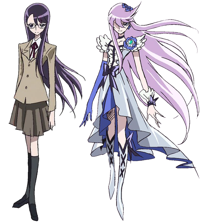 As Cure Moonlight, her eyes turn bright turquoise. Her curled hair grows partially longer and turns lavender, with sharpened bangs that spread across her face to partially obscure her right eye, while the rest of her hair sticks up on the left and is adorned with a cluster of indigo roses. She gains another forelock at the right to balance her left forelock out, as both grow a little pass the torso. She wears a long, silver ankle-length dress that features dark indigo lining on top and straps, as well as horizontally in the middle, complemented by white ruffles jutting at either side to match her two-layered wing-like sleeves. She has crisscrosses at the back. A ribbon wraps around her navel at the right, accentuating her choker, her left wristband with a ribbon on top, and the V-shaped lining, back bows, and two horizontal crisscrosses on her boots. On her heart on the left is an indigo rose with a cyan heart-shaped brooch lined in silver that's the Heartcatch! insignia in the center, with white, blue, pink, and gold tiny beads on the top of the border that complements the secondary skirt layer beneath the dress that splits at the right, her flower-shaped earrings, and single opera glove on her right arm. Her wrist piece has a white ruffle jut out, and her boots are silver.