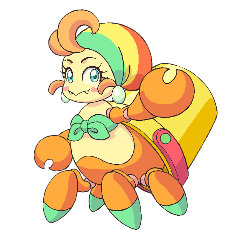 Yanyan is a hermit crab-like alien who has an orange body and bluish green eyes. She wears a beanie which is orange, yellow, and green, with orange tufts of hair sticking out. The tips of her feet are green. She carries a yellow sand bucket on her back.